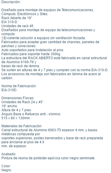 RACK ABIERTO 19″ X 7 PIES 42 UR CON POSTES DE ALUMINIO, BASES Y CIERRES DE ACERO.
