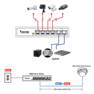 Conmutadores PoE no administrados FE de VIVOTEK con el interruptor DIP proporciona modos operativos ST estándar y EX EXtender. Ellos están especialmente diseñados para aplicaciones de vigilancia IP. Además funciones estándar 802.3af / at PoE en modo ST, el modo EX también transmite datos y energía en un solo cable de hasta 200 metros a 10 Mbps a través de puertos EX específicos para cámaras IP PoE de largo alcance.