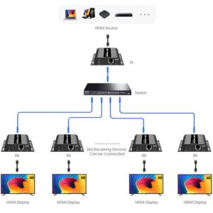 El Receptor Extensor HDMI LK-LKV383-RX HDbitT, permite múltiples unidades receptoras, hasta 253 unidades. Para conectarse a 1 transmisor a través de un interruptor compatible con IGMP. Hasta una distancia máxima de 120 m, se utiliza en situaciones en las que la señal de un transmisor debe recibirse en varios puntos. En este caso, el sistema realizará no solo las funciones de un cable de extensión, sino también un divisor HDMI.