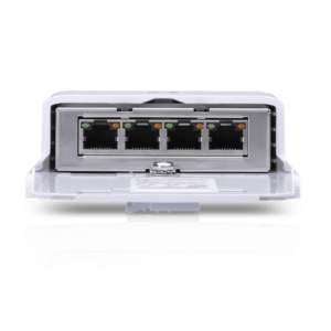 Está alimentado por PoE pasivo de 24 V y proporciona hasta 24 W de potencia en tres puertos de salida PoE. El NanoSwitch está diseñado para su implementación en exteriores y admite hasta 4 Gbps de velocidad de línea sin bloqueo en total.