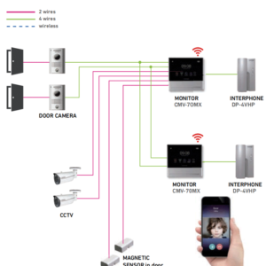 COMMAX CMV70MXP – Paquete de monitor Wifi para videoportero con notificación al celular a traves de aplicacion Commax Hey Call/ Android&iOS / Monitoreo de camara desde app/ Conexión a 4 hilos con frente de calle/ Soporta 2 sensores magneticos/ 2 frentes