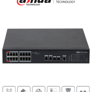 DH-PFS4218-16ET-240 es un tipo de conmutador PoE administrado de capa dos. Proporciona 16 puertos PoE de 100 Mbps y puertos combinados de enlace ascendente de 2 gigabits. La carga completa es de 240W. Con un diseño totalmente metálico, el producto tiene una buena disipación de calor y un bajo consumo de energía, que puede funcionar en entornos de -10 °C a   55°C.