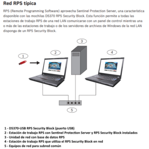El D5370‑USB es un accesorio de seguridad para RPS. Sin él, la comunicación no es posible. Se conecta al puerto USB del PC y es de color rojo.